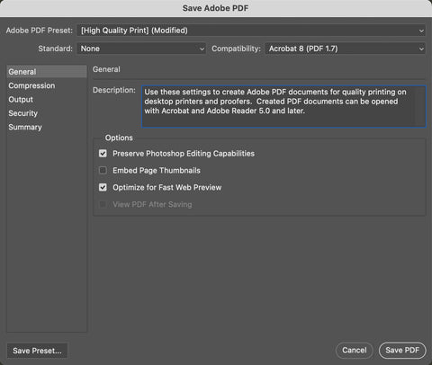 Im Exportdialog wählst du das Preset "High Quality Print" aus und stellst die Kompatibilität auf "Acrobat 8 (PDF 1.7)" ein.