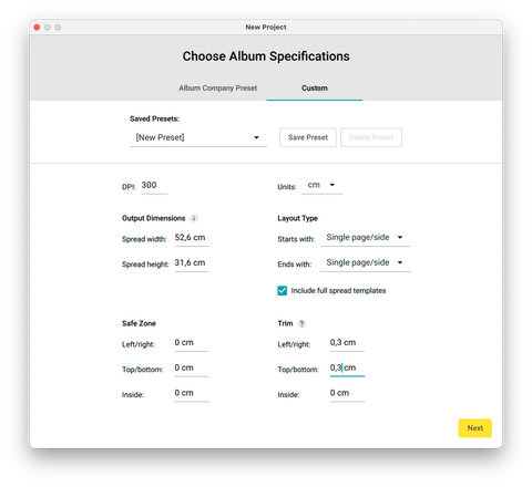 Zum Erstellen eines neuen Bildbands kannst Du die Parameter aus dem Screenshot eintragen. Die Output Dimension kannst du folgendermaßen berechnen: