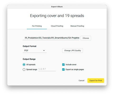 Für den Export können die Einstellungen aus dem Screenshot verwendet werden. Das erzeugte PDF beinhaltet Schutzumschlag und Buchblock und kann auf der edition mono Webseite hochgeladen werden.